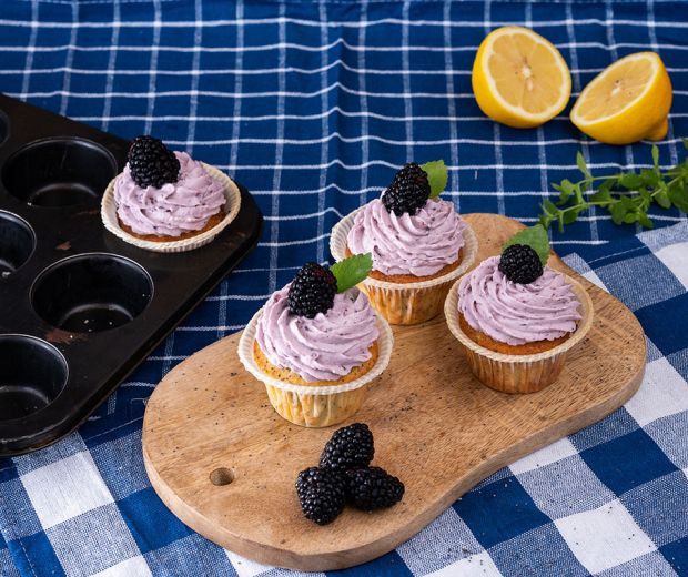 Tăiem mijlocul cupcake-urilor și punem o linguriță de dulceață de mure în mijloc, punem puțină cremă deasupra și decorăm cu mure proaspete.
