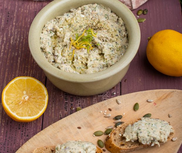 Punem peștele într-un bol de amestecat și, folosind o furculiță, îl mărunțim în bucăți mai mici. Adăugăm ceapa tăiată fin, oul ras, frunzele de mărar mărunțite fin, untul și smântâna, după care amestecăm cu o lingură de lemn până se omogenizează. Condimentăm cu zeamă de lămâie, sare și piper după gust.