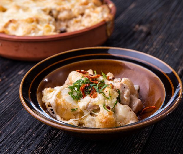 În primul rând, pregătim sosul cu praz. Într-o oală topim untul și adăugăm prazul și usturoiul mărunțit și crenguțele de rozmarin. După ce s-au înmuiat legumele, adăugăm vinul, fierbem puțin timp, după care adăugăm smântâna. Condimentăm cu sare, piper și mai fierbem la foc mic încă 15 minute. Între timp, curățăm și feliem cartofii – putem folosi o mandolină sau un cuțit ascuțit. Punem cartofii într-un bol de amestecare, turnăm peste sosul cu praz și amestecăm bine, după care turnăm într-un vas termorezistent și întindem frumos. Apăsăm ușor cu mâinile și presărăm bogat cu caș ras. Coacem în cuptor preîncălzit la 180 de grade până se rumenește frumos. Scoatem și lăsăm să se odihnească 5-10 minute.