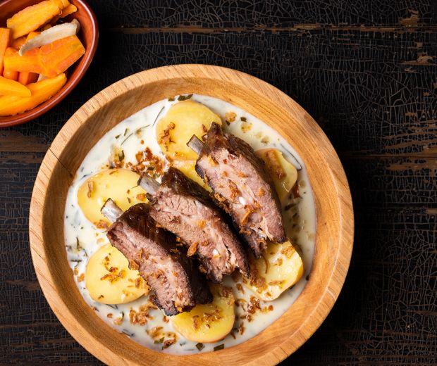 Costiță afumată cu cartofi în sos cu tarhon