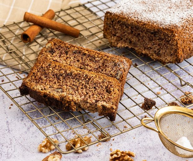 Începem să batem până la spumare untul cu zahărul, după care adăugăm ouăle. Zdrobim bananele cu o furculiță și le adăugăm la aluatul cu ou. Amestecăm făina, făina de ovăz, praful de copt, bicarbonatul de sodiu, sarea și scorțișoara. Încorporăm ingredientele uscate în aluatul de banana, iar la sfârșit, adăugăm și smântâna și nuca mărunțită. Turnăm într-un vas uns cu unt și coacem în 70-80 de minute la 160 de grade – timpul de coacere depinde de grosimea și înălțimea vasului, deci merită să verficăm cu testul scobitorii. Când este gata, lăsăm să se răcească complet, după care feliem și servim.