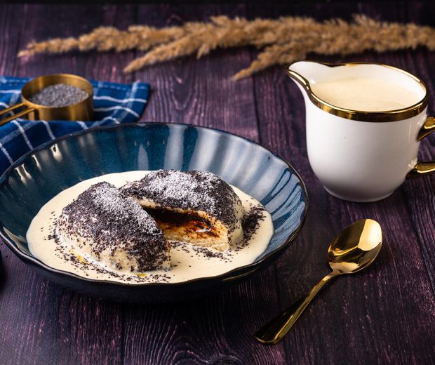 Pentru aluat, punem făină într-un bol, adăugăm zahărul, sarea, oul și în mijloc punem drojdia zdrobită în firimituri. Încălzim ușor laptele, îl turnăm la amestecul de făină și începem să frământăm aluatul. Între timp topim untul și îl adăugăm la aluat, după care frământăm aluatul, trebuie să obținem o compoziție moale și lucioasă. Lăsăm la dospit timp de o oră la un loc călduț. Când s-a dospit, împărțim aluatul în opt porții egale, le întindem în formă de cerc pe fiecare, iar în mijlocul cercurilor punem o lingură bună de dulceață de prune. Tragem marginile aluatului și le ciupim astfel încât să se lipească foarte bine. Mai modelăm ușor ca să obținem o formă de bilă. Bilele umplute le mai dospim încă o oră. Pentru sosul de vanilie, punem la încălzit laptele și smântâna, iar gălbenușurile de ou, amidonul, semințele de vanilie și zahărul le amestecăm bine. Turnăm la acest amestec laptele călduț, după care turnăm totul într-o oală și, amestecând continuu, îngroșăm sosul. Punem niște apă într-o oală mai mare, iar pe oală punem o sită. Găluștele dospite le ungem cu unt, le așezăm frumos în sită și acoperim cu un capac, ca să nu scape aburul. Pregătim găluștele în 15 minute, după care le mai ungem încă o dată cu unt. Servim cu sos de vanilie, presărat cu mac și zahăr pudră.