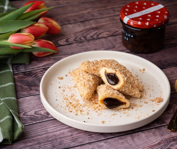 Curățăm cartofii, îi tăiem în bucăți mai mari și îi pregătim în apă sărată. Îi strecurăm și îi zdrobim cu un zdrobitor de cartofi cât încă sunt fierbinți. Lăsăm să se răcească, după care adăugăm oul, grișul de grâu, untura, sarea și începem să frământăm, adăugăm făina și încorporăm toate ingredientele cu cât mai puține mișcări. Dacă aluatul este prea moale, mai putem pune niște făină. Întindem aluatul pe o suprafață presărată cu făină cu grosimea de 0,5 cm, după care tăiem pătrate de dimensiuni egale, după preferință. În centrul fiecărui pătrat punem o lingură de gem de prune, apoi pliem colțurile opuse unul peste altul și presăm marginile pentru a le sigila. Într-o oală mai mare încălzim apă până la fierbere, punem niște sare, după care fierbem pastele umplute până ce se ridică la suprafața apei. Prăjim ușor pesmetul în ulei, dăm prin pesmet pastele și servim.