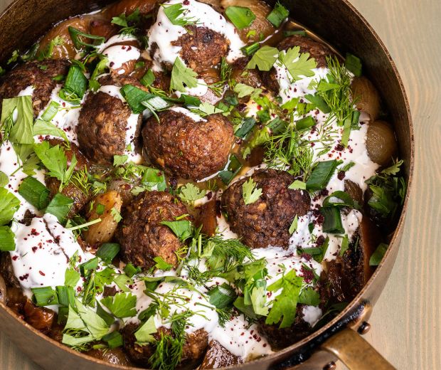 Intr-un bol amestecăm carnea tocată, ceapa, usturoiul și pătrunjelul mărunțit, oul, după care condimentăm cu scorțișoară, ienibahar, sare și piper negru proaspăt măcinat. Modelăm din acest aluat bile de dimensiunea unei nuci, pe care le prăjim până ce se rumenesc în ulei fierbinte. Este mai bine să lucrăm treptat. Punem chiftelele la o parte. Curățăm tigaia, după care prăjim pe fiecare parte cepele întregi. Scoatem cepele, turnăm vin în tigaia fierbinte, evaporăm jumătatea vinului, după care punem înapoi cepele prăjite, chiftelele, adăugăm smochinele, foile de dafin și cimbrișorul. Turnăm peste fondul, condimentăm cu sare, piper și niște zahăr. Acoperim cu un capac și gătim timp de 30 de minute. Servim cu iaurt și amestec de ierburi condimentare. Putem servi cu orez sau bulgur.