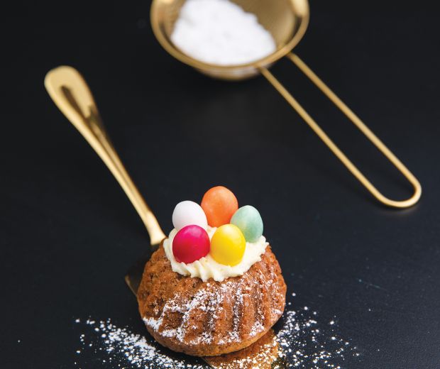 Amestecăm ingredientele uscate într-un bol, topim ciocolata cu untul pe baie de aburi și lăsăm să se răcească puțin. Între timp amestecăm ouăle cu ingredientele uscate, iar la sfârșit adăugăm masa de ciocolată și unt. Transferăm aluatul în formele de gugulufi – formele trebuie umplute la aproximativ trei sferturi – și coacem într-un cuptor preîncălzit la 180 de grade timp de aproximativ 15 minute. Pentru cremă, batem frișca până obținem o spumă tare. Amestecăm frișca cu mascarpone și zahăr praf și batem până avem o cremă spumoasă. Umplem mijlocul gugulufilor răciți cu cremă, după care decorăm cu cremă de mascarpone și drajeuri în formă de ouă.
