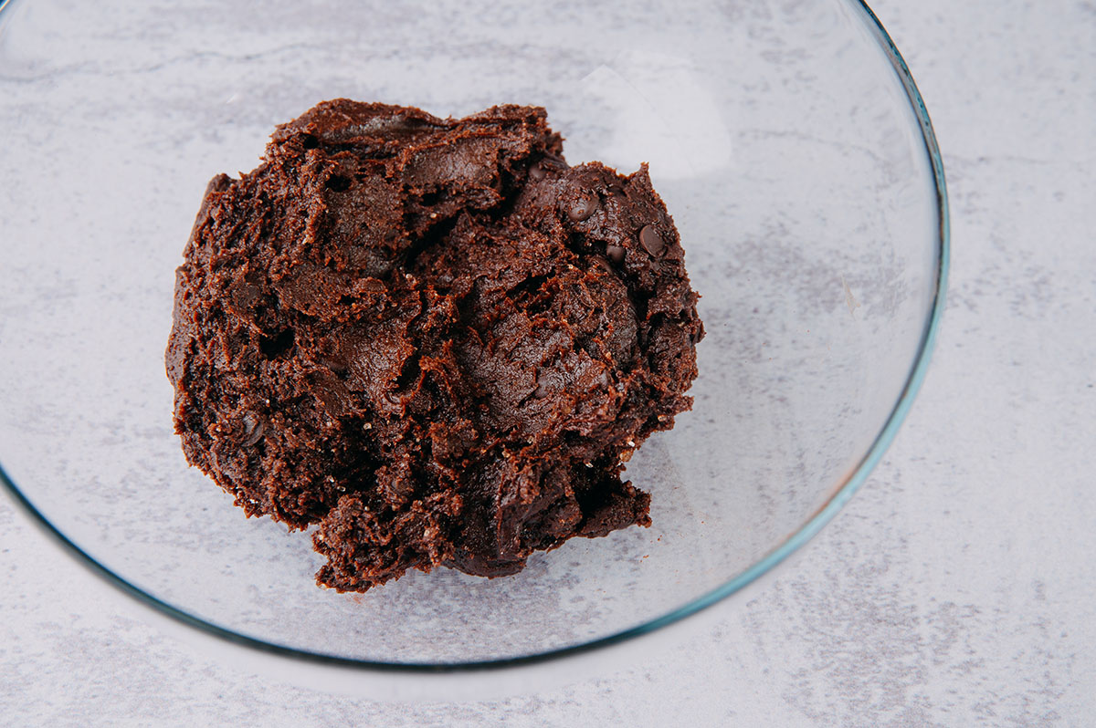 Amestecăm făina, cantitatea de cacao, zahărul brun, zahărul cristal și sarea. Topim untul și amestecăm, cu ajutorul unui tel, cu ouăle la temperatura camerei. Amestecăm aluatul cu amestecul de făină și încorporăm ciocolata tăiată în bucăți mici (putem folosi și pastile de ciocolată).