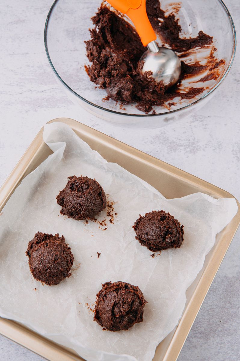 Cu ajutorul unei linguri dozatoare pentru înghețată modelăm bile mici din aluat și le transferăm într-o tavă tapetată cu hârtie de copt. Să nu le apăsăm, se vor întinde în timpul coacerii!