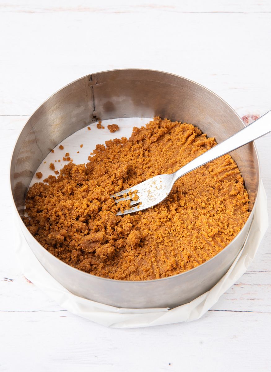 Pentru blat zdrobim biscuiții de ovăz într-un tocător, amestecăm cu untul topit și dulceața de caise. Turnăm aluatul în forma de tort și aplatizăm bine cu mâinile. Punem la frigider și pregătim crema.