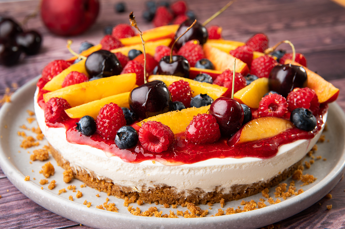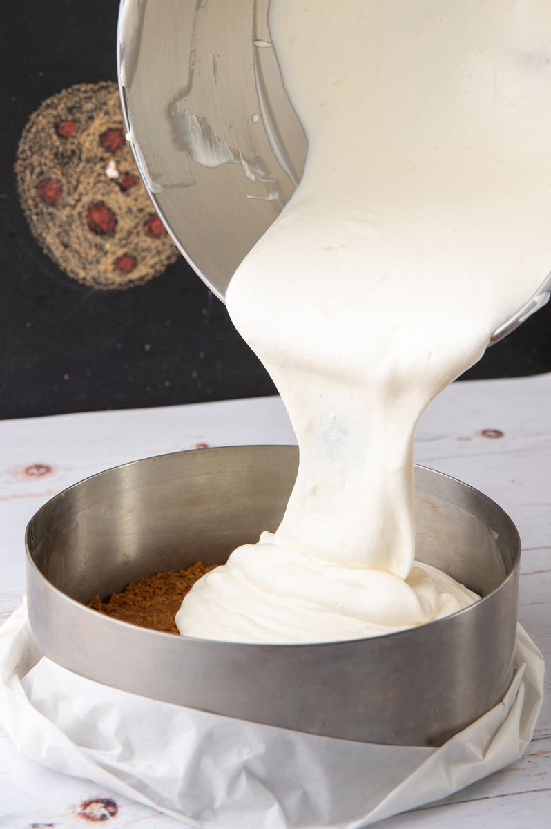 Punem la înmuiat foile de gelatină în apă rece ca gheața. Începem să amestecăm mascarpone-ul cu zahărul pudră folosind un mixer de mână, apoi adăugăm iaurtul și celelalte ingrediente și amestecăm până obținem o cremă omogenă. Foile de gelatină le stoarcem bine, le topim într-un vas la foc mic, adăugăm 3-4 linguri din cremă, amestecăm compoziţia până devine omogenă, apoi o turnăm înapoi în restul cremei și amestecăm bine. Turnăm compoziția peste baza de biscuiți și o punem la frigider pentru 4-5 ore. După ce tortul s-a întărit, îl scoatem din formă, ungem partea de sus cu dulceață de zmeură și decorăm după preferință cu fructe proaspete.