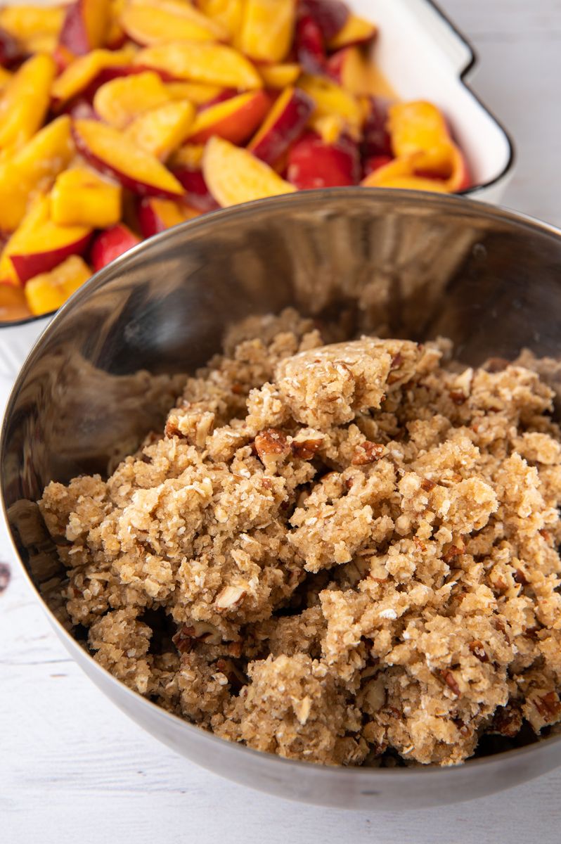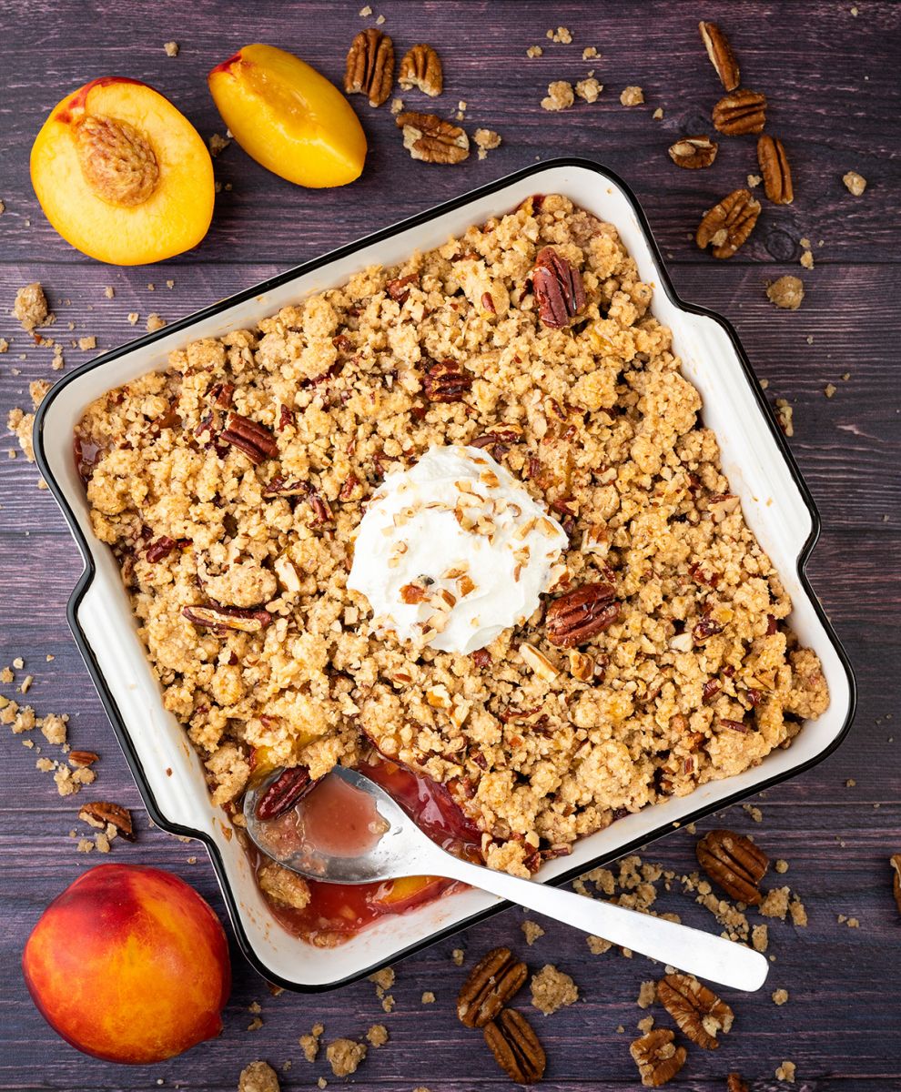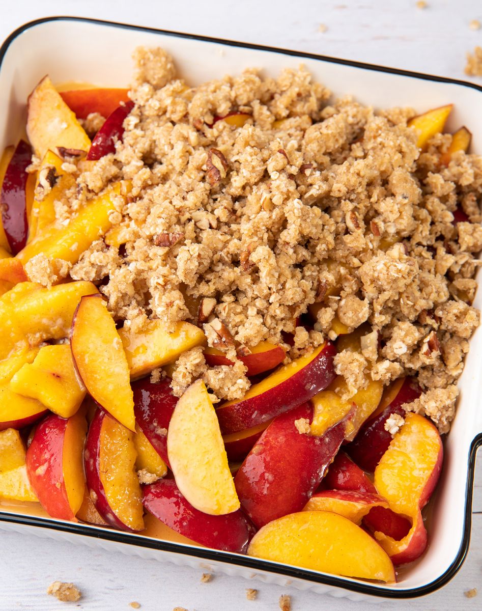 Pentru crumble punem toate ingredientele uscate într-un bol, adăugăm untul rece, tăiat în cubulețe și amestecăm – ori cu mâinile, ori cu un robot de bucătărie – până obținem un aluat cu o textură asemănătoare pesmetului. Tăiem nectarina în felii mai groase, amestecăm zahărul cu amidonul și trecem feliile de nectarină prin acest amestec, așezându-le după aceea pe fundul tăvii. Întindem aluatul cu nuci pecan peste fructe și coacem prăjitura la cuptor preîncălzit la 170 de grade timp de 20-25 de minute. Servim cu înghețată de vanilie sau frișcă.