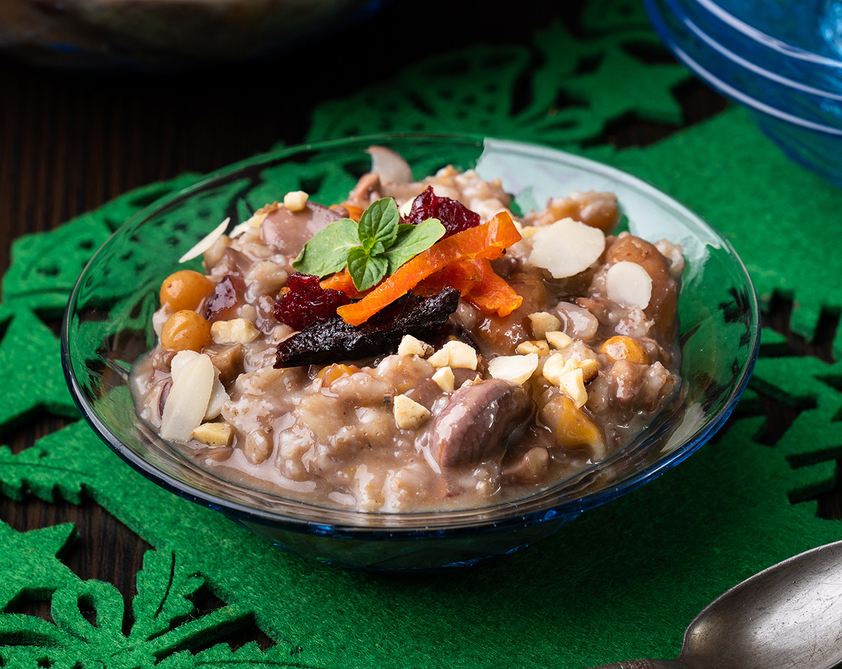 Punem fructele uscate la înmuiat pentru câteva ore, punem la fiert în 3 dl de apă scorțișoara și cuișoarele, încălzim până la fierbere, după care strecurăm – sucul nu îl aruncăm! Fructele înmuiate, împreună cu nuca, migdalele și puțină sare le punem în sucul condimentat și fierbem timp de 30 de minute. Adăugăm fulgii de ovăz și fierbem pe foc mic, până se înmoaie și ovăzul. Condimentăm cu zahăr, zahăr vanilat, miere și coajă rasă de lămâie.