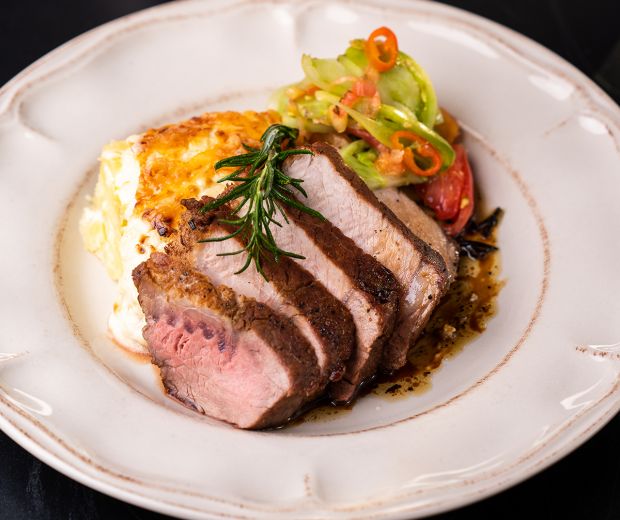 Cartofi gratinați cu praz cu muschiuleț prajit și salata de gogonele