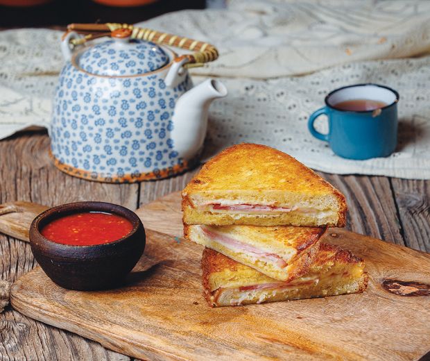 Ungem feliile de pâine cu unt. Punem pe 4 felii de pâine câte două felii de șuncă și brânză – în straturi – după care acoperim cu cealaltă felie de pâine. Apăsăm bine pentru a le fixa. Batem ouăle într-o farfurie pentru supă, condimentăm cu puțină sare, după care trecem sandwich-urile prin ouă. Le prăjim într-o tigaie cu fund gros, în ulei fierbinte. Putem servi cu un ceai fierbinte.