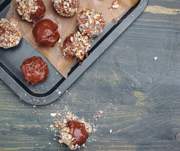 Este un desert ideal pentru perioada de după sărbători, deoarece se folosește baigli-ul mai vechi, uscat. Zdrobim şi rupem baigli-ul – trebuie să obținem o consistență de firimituri – punem într-un bol, adăugăm dulceața de caise și amestecăm bine. Modelăm bile mici din această mixtură și le punem la frigider pentru 10-15 minute, ca să se întărească puțin. Între timp topim untul și ciocolata peste o baie de aburi. Înfingem bomboanele de baigli pe bețe de frigărui și le scufundăm una câte una în ciocolata topită, după care le trecem prin nucă sau migdale. Bomboanele le punem pe o tavă tapetată cu hârtie de copt și le punem în frigider pentru câteva minute ca să se întărească. Sunt ideale dimineața, lângă o cafea sau ca o gustare pentru musafiri.