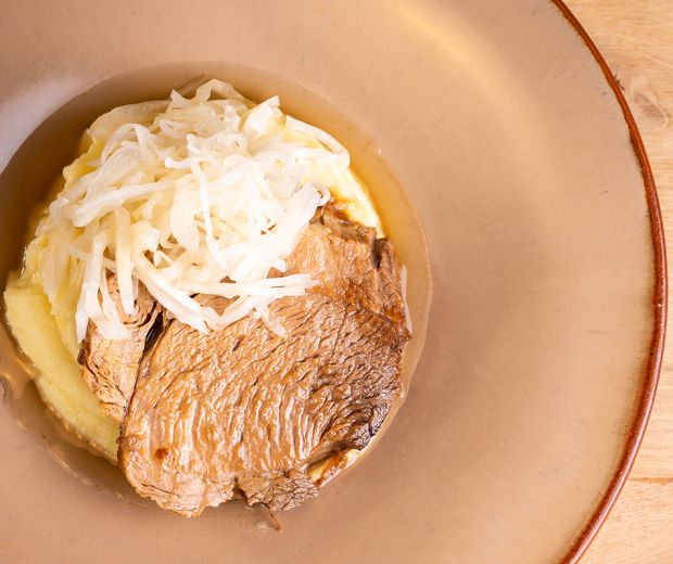 Încingem o lingură de untură într-un vas de fontă, cu pereți mai groși și prăjim în acesta fiecare parte a pulpei. Turnăm peste vinul, iar după ceva timp adăugăm și untura. Trebuie să acopere carnea până la mijloc. La foc foarte mic – să fiarbă cu clocote foarte mici – pregătim în două ore. Între timp, pregătim un piure de cartofi. Merită să folosim un tip de cartof pentru piure – categoria C. Curățăm cartofii, îi tăiem în bucăți mai mari și îi pregătim în apă sărată. Strecurăm, lăsăm câteva minute să se evapore cât mai multă apă, apoi adăugăm treptat untul rece tăiat în cuburi, zdrobind cu un zdrobitor de cartofi. Dacă amestecul nu este destul de cremos, mai adăugăm lapte cald, amestecând piureul cu un tel. Dacă este necesar, mai adăugăm ușor sare. După ce carnea se înmoaie o scoatem din untură, iar în untură punem usturoi mărunțit. Carnea o feliem și o punem înapoi în untura aromată. Lăsăm să stea puțin, după care servim cu piure de cartofi și varză murată. Este musai să stropim ușor preparatul cu untură!