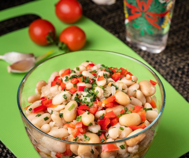 Punem la înmuiat fasolea în apă peste noapte, iar a doua zi o pregătim în apă sărată. O strecurăm și o lăsăm să se răcească complet. Feliem ceapa, condimentăm cu sare, piper și o călim în ulei. Fasolea rece o amestecăm cu ceapa, condimentăm cu oțet, zahăr și sare.