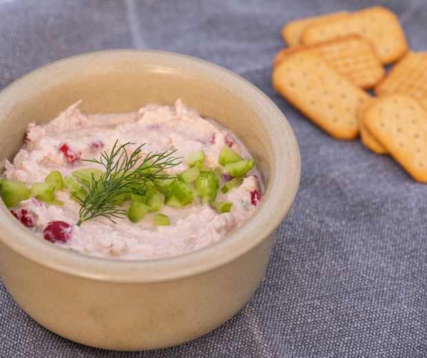Strecurăm tonul și adăugăm ardeiul kapia și tulpina de țelină mărunțită, iaurtul grecesc, brânza cremă, coaja și zeama de lămâie, hreanul murat, sarea, piperul și amestecăm bine. Servim pasta de ton cu baguette prăjit și mărar.