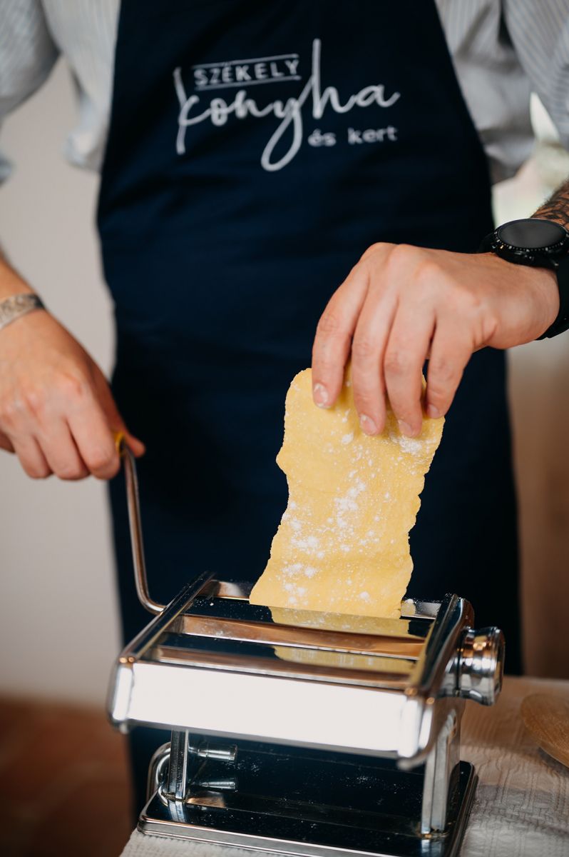 Folosind mânerul unei linguri de lemn și apăsând aluatul, formăm mici triunghiuri în pastele noastre umplute – să nu apăsăm prea tare – după care, cu ajutorul unui feliator de pizza, tăiem triunghiurile. Într-o tigaie fierbinte, în niște unt, le prăjim puțin.