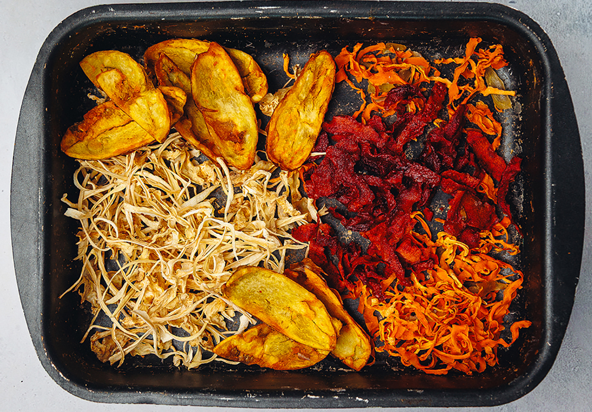 De fapt, asta nici nu prea poate fi numită rețetă, iar pregătirea nu este o mare provocare. Totuși, este importantă, pentru că reprezintă unul dintre cele mai practice moduri de a folosi cojile care altfel ar ajunge la gunoi. Se poate face cu un amestec de coji sau din cojile anumitor legume. Esențial este ca cojile de cartofi și de sfeclă să fie prăjite în ulei, iar celelalte coji de legume să fie uscate într-un cuptor cu aer cald, la 80 de grade, timp de câteva ore – ca într-un deshidrator. Procesul merge mai repede dacă ușa cuptorului poate fi lăsată deschisă, cam o jumătate de centimetru, pentru a permite aburului să iasă. Rezultatul final poate fi consumat în sine, dar poate fi folosit la prepararea unui amestec uscat de condimente – sau chiar o pudră de condimente.