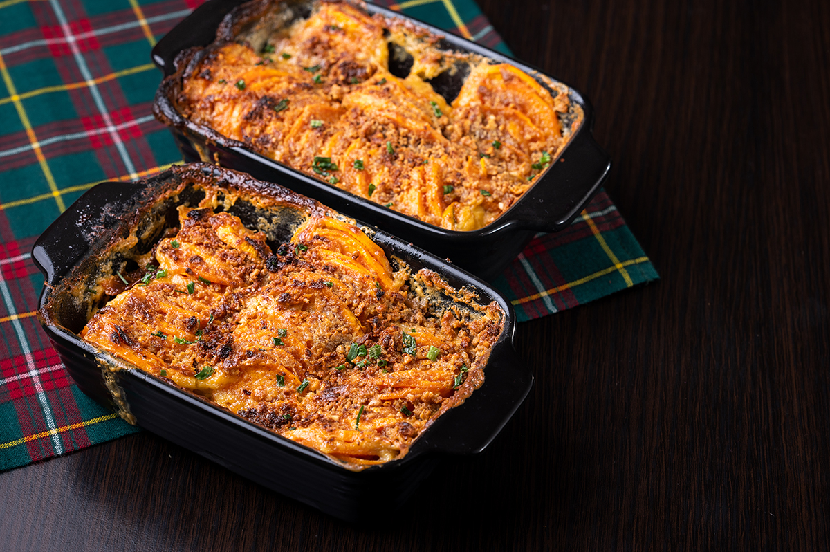 Cartofii-dulci curățați și feliați în felii subțiri îi amestecăm cu un amestec de fulgi de chili, usturoi zdrobit, o lingură de ulei de măsline, sare, piper și smântână de gătit. Ungem cu ulei de măsline un vas termorezistent/tavă și așezăm feliile de batata în această tavă astfel încât să se suprapună parțial. Ungem cu un amestec de unt de arahide, 4 linguri de ulei, coajă de lime și 2 lingurițe de suc de lime, după care turnăm peste și restul de zeamă cu smântână de gătit. Acoperim cu o folie de aluminiu, coacem 20 de minute la 190 de grade, după care încă 20 de minute fără folie. Când s-a rumenit frumos, putem să scoatem.