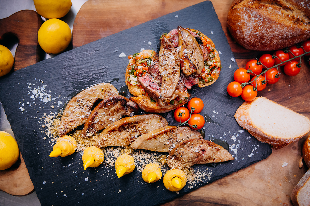 Steak de vită pregătit în două feluri, servit cu piure de dovleac și ficat de rață